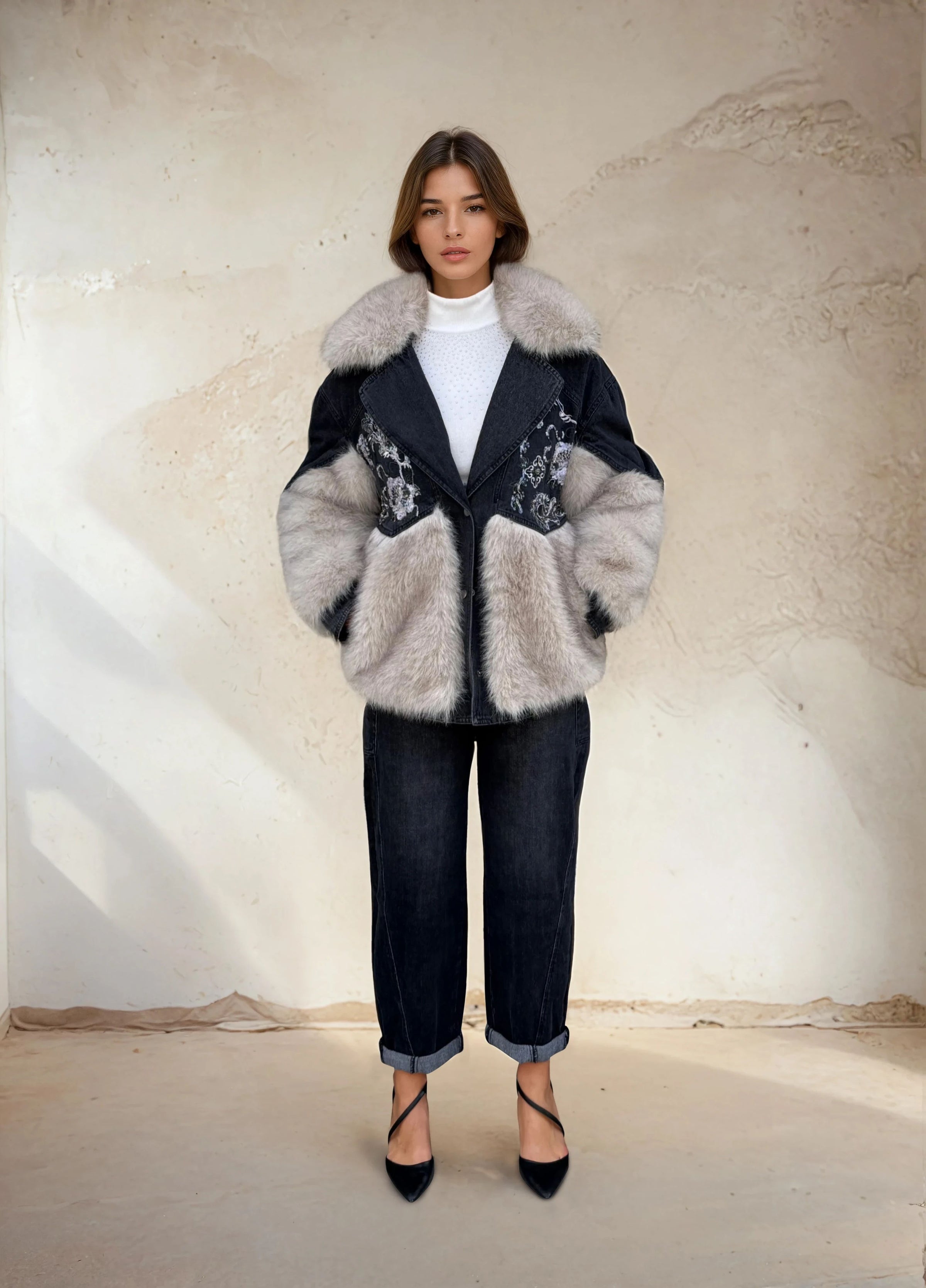 Elevate your outerwear with this bold denim and faux fur jacket — a perfect fusion of edgy denim and luxurious texture. Designed with a relaxed silhouette, this jacket features soft faux fur panels on the collar and sleeves, creating a striking contrast against the deep indigo denim body. Embroidered floral detailing across the chest adds an artistic touch, while the plush fur collar brings warmth and elegance.