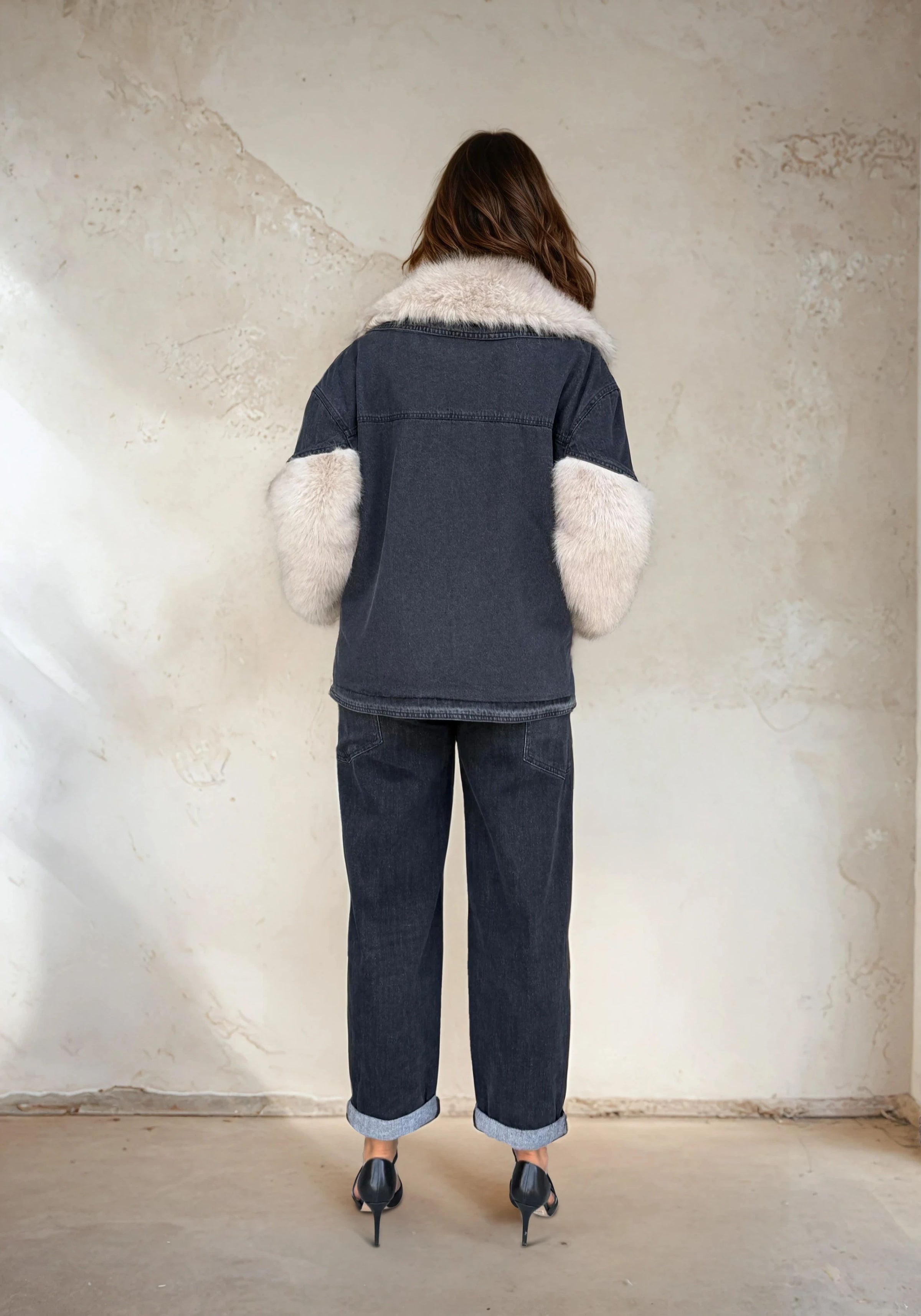 • Premium denim base with faux fur accents
