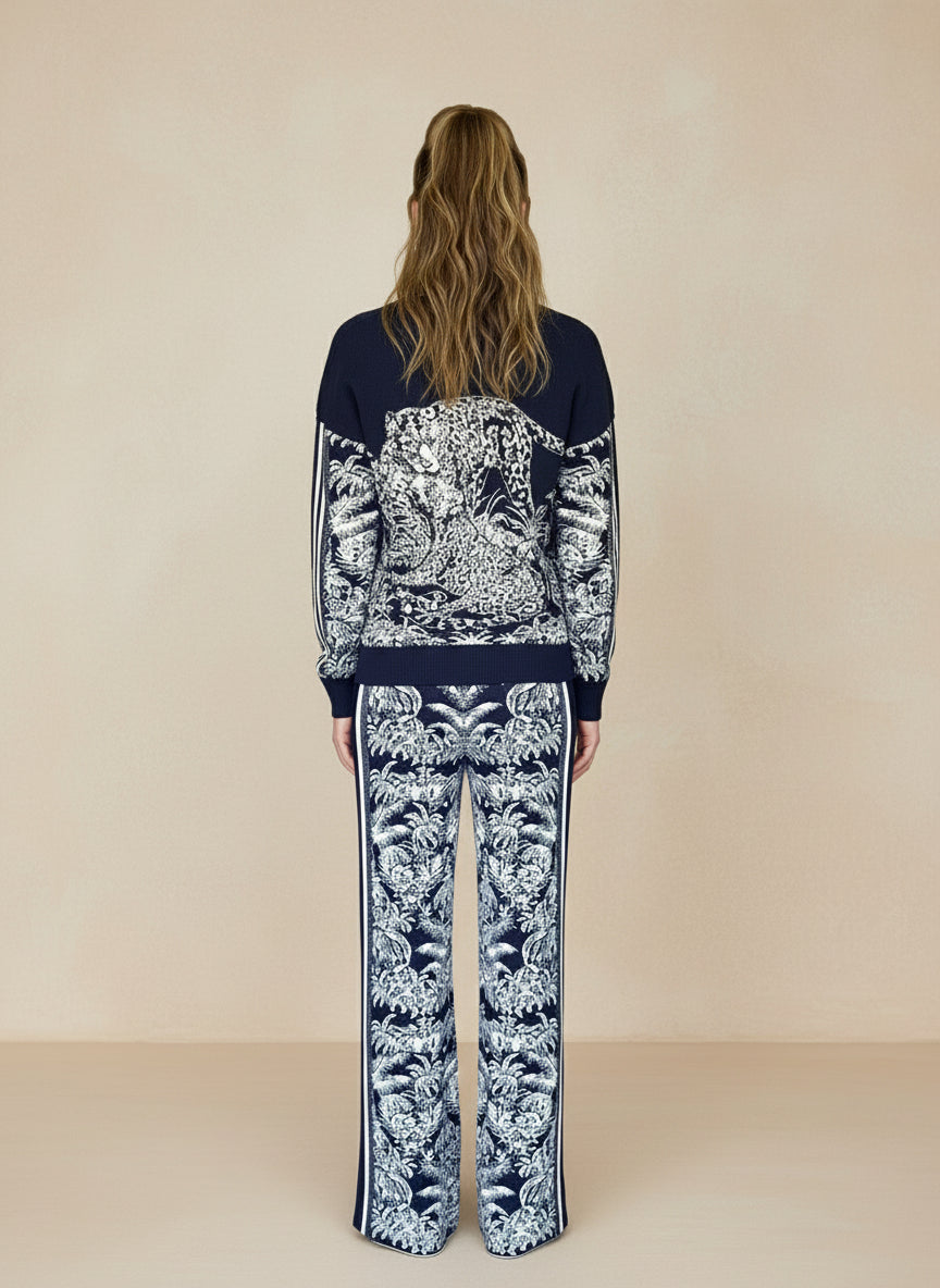- Statement Print: Intricate jacquard knit with tropical foliage and leopard detailing.