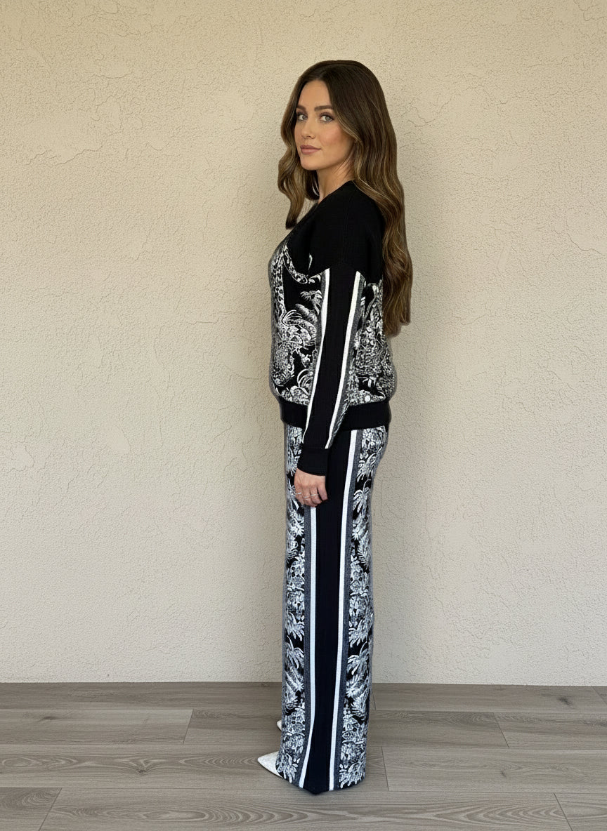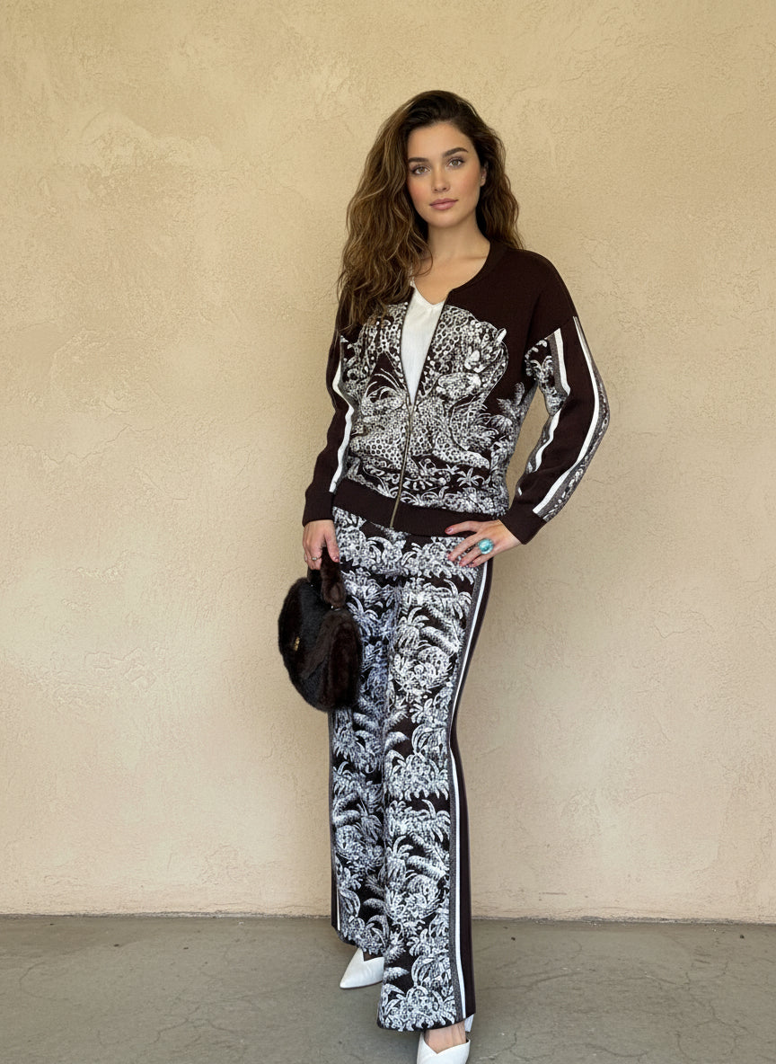 Step into bold style with these wide-leg knit pants featuring an intricate jungle design. A perfect balance of comfort and statement fashion, these pants are made to stand out while keeping you effortlessly chic.